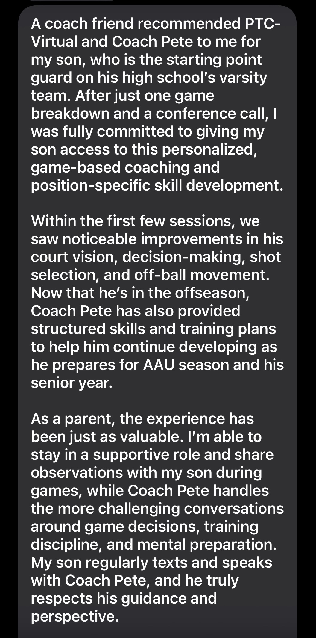 Together, we are PTC Virtual. We've combined my three decades of NBA-level experience with Pete's modern, in-the-trenches perspective to create the most comprehensive online basketball mentorship program in the world. We don't just build skills; we build players. We build confidence. And we build futures.